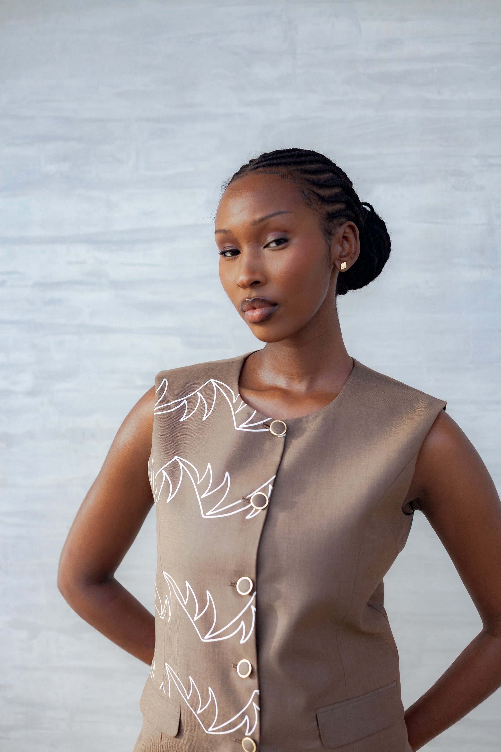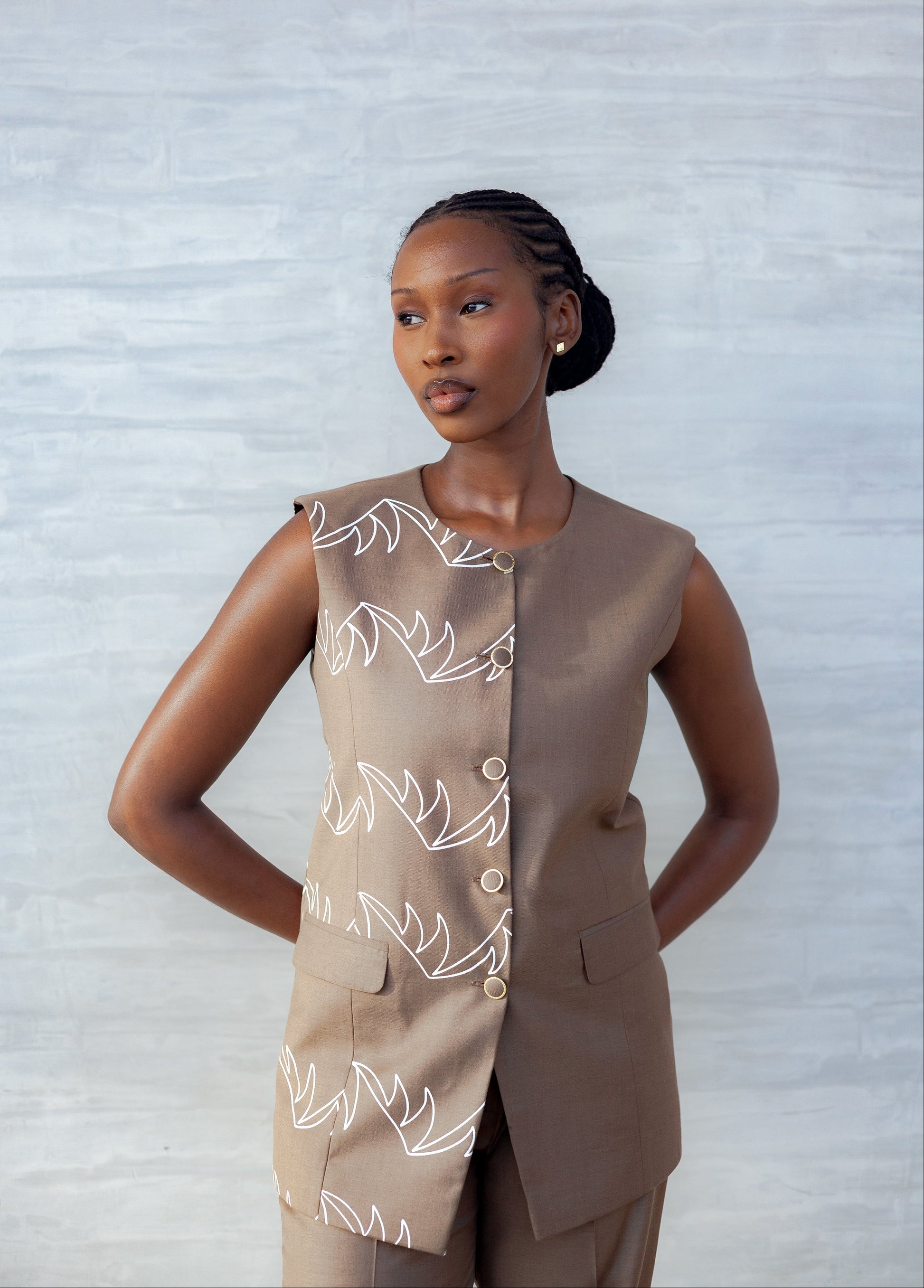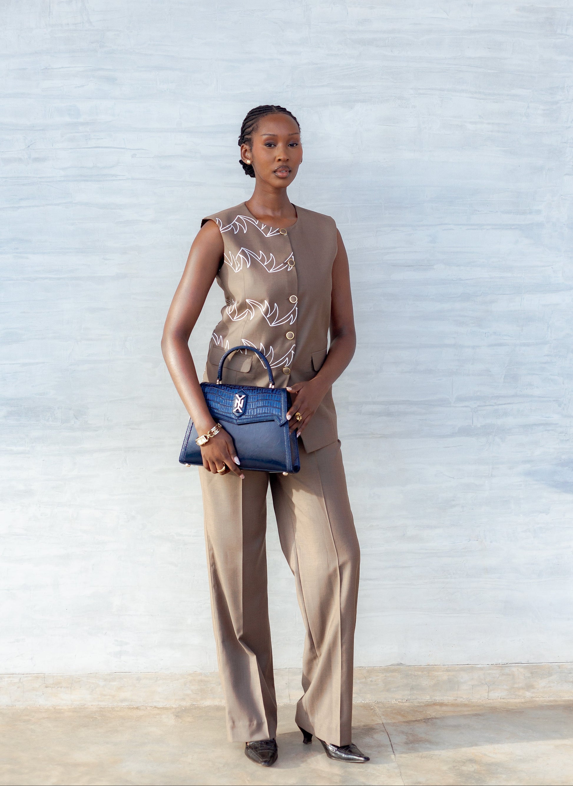 A refined sleeveless jacket suit crafted in a wool–cotton blend, finished with Izubaa’s signature handcrafted Ibaba prints. Its sculpted silhouette and heritage-inspired tailoring create a modern, confident look that transitions effortlessly from day to evening.