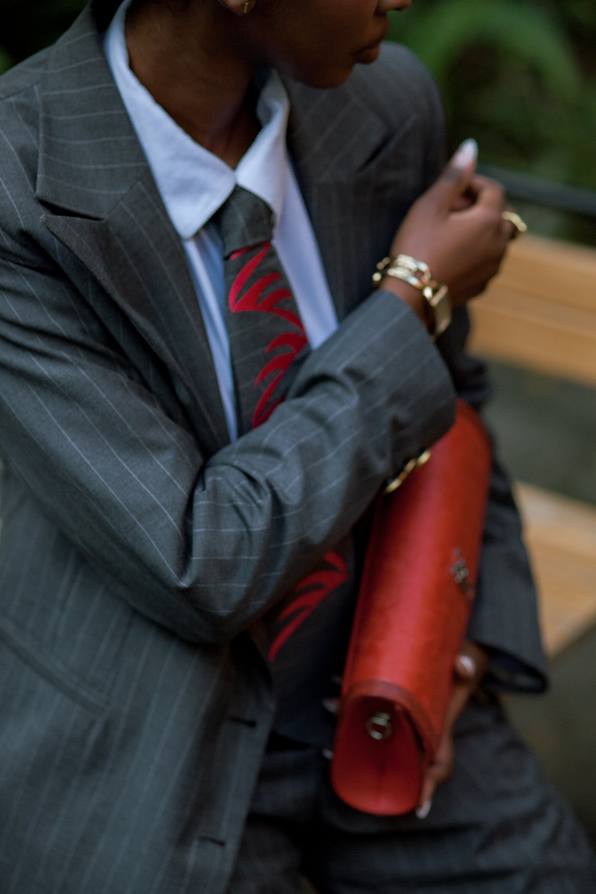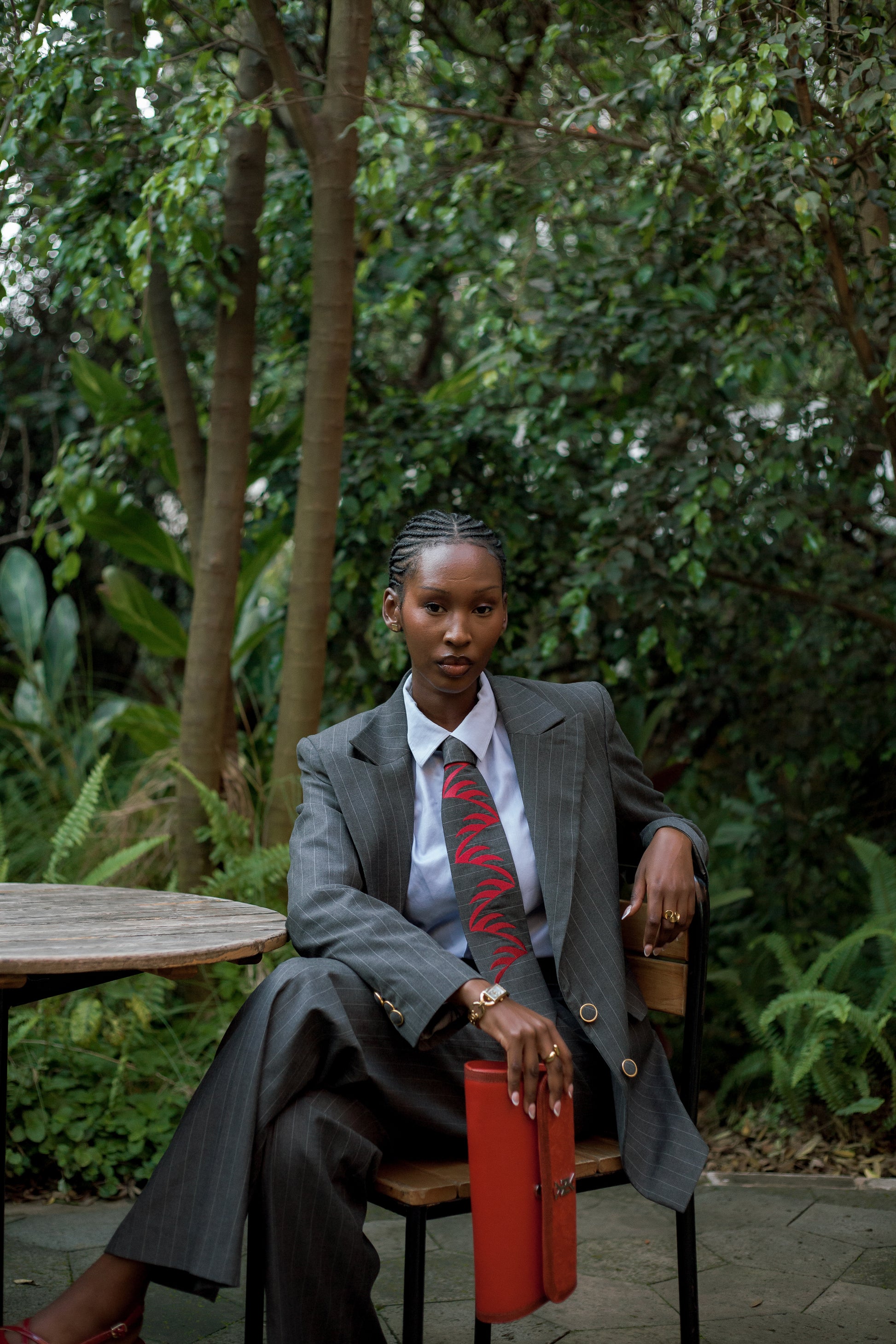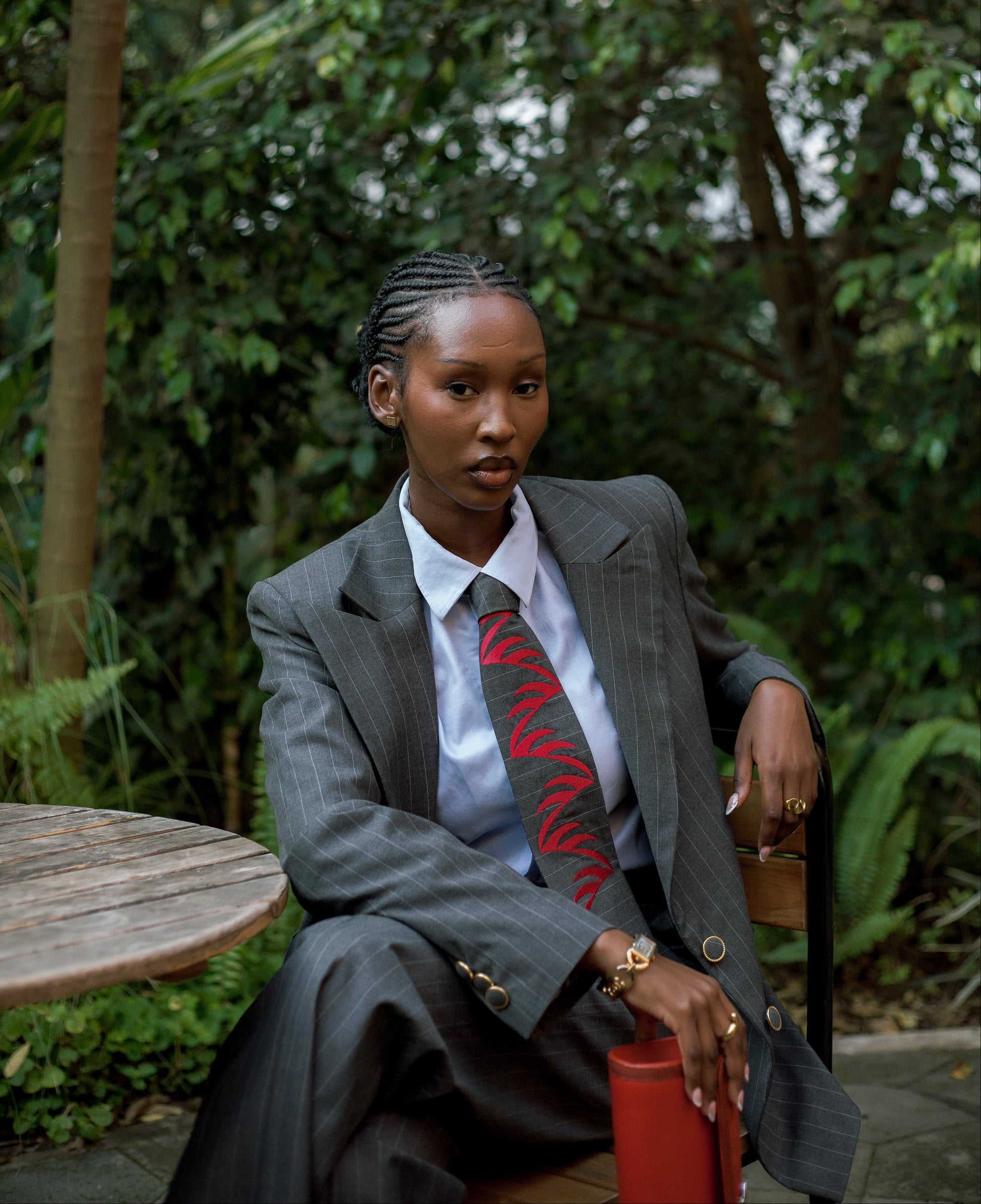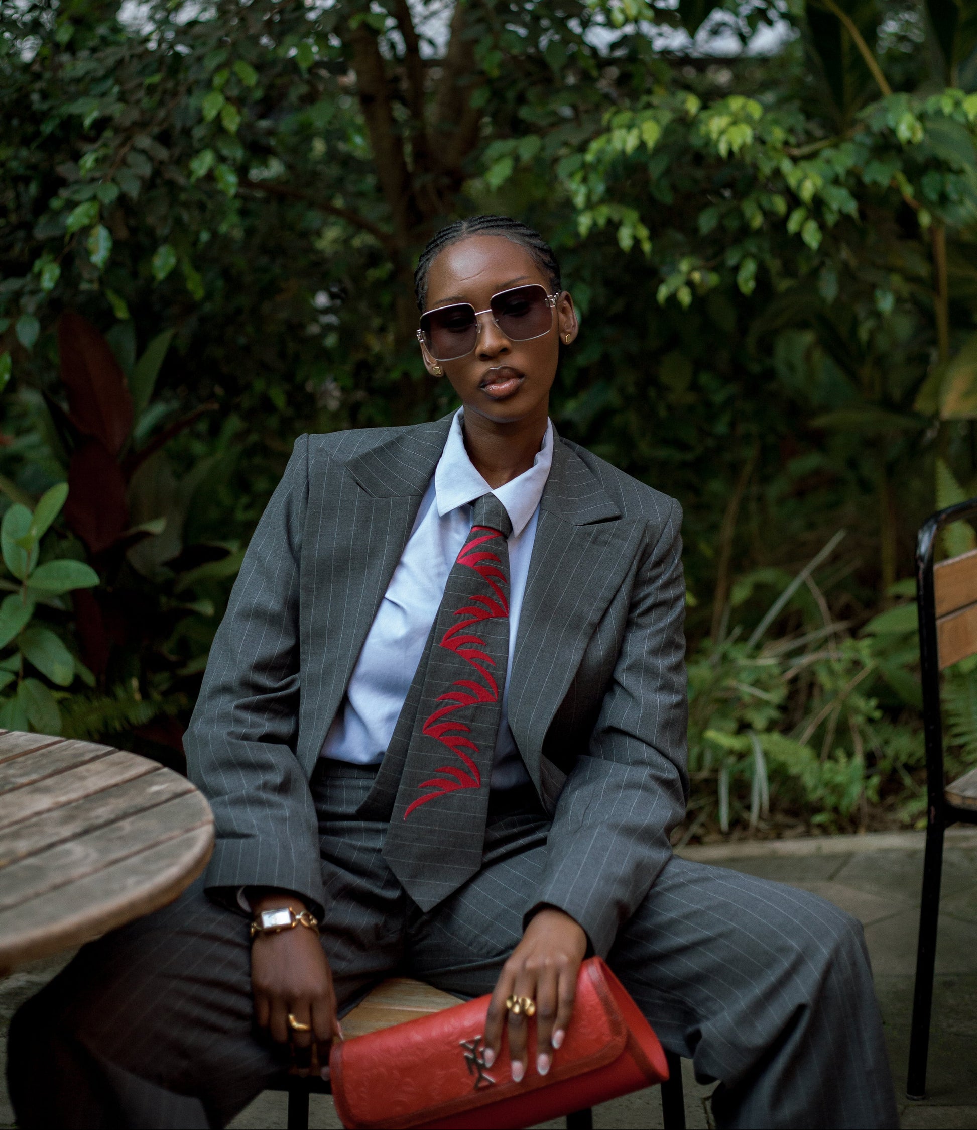 Crafted from a grey pinstripe mixed-wool, the Izubaa Power Suit brings together structure and fluidity in one refined silhouette. The single-button jacket sharpens the waistline while maintaining a clean, modern line.